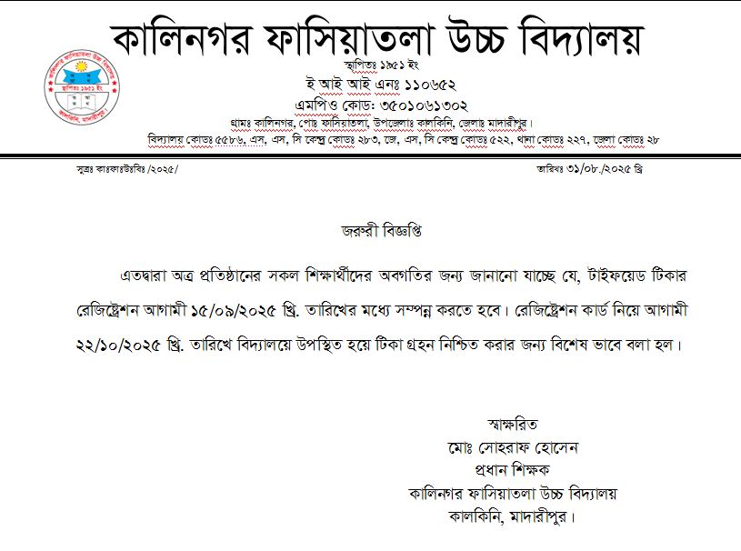 | টাইফয়েড টিকার বিজ্ঞপ্তি | 31-08-2025 | |